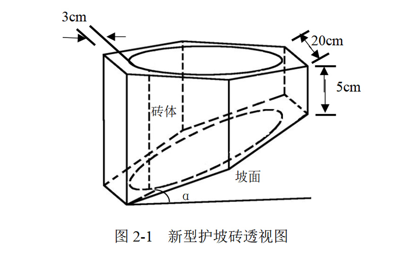 新型護坡砌塊為正六邊形,中空,內(nèi)空部分為正六邊形或圓形,底端面與水平面成一夾角α,夾角α的大小與所護邊坡坡度相匹配(如圖2-1),這樣,在坡面鋪設護坡砌塊時,護坡砌塊底部也與坡面相吻合,上端能夠保持水平,確保砌塊內(nèi)土體的表面保持水平穩(wěn)定狀態(tài),最大程度地保持土壤。
