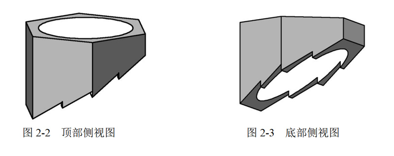 新型護坡砌塊為正六邊形,中空,內(nèi)空部分為正六邊形或圓形,底端面與水平面成一夾角α,夾角α的大小與所護邊坡坡度相匹配(如圖2-1),這樣,在坡面鋪設護坡砌塊時,護坡砌塊底部也與坡面相吻合,上端能夠保持水平,確保砌塊內(nèi)土體的表面保持水平穩(wěn)定狀態(tài),最大程度地保持土壤。